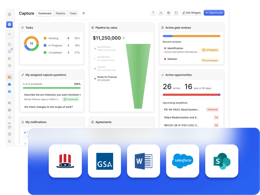 .GovDash seamlessly integrates with the tools you already use, from opportunity tracking to document management. Spend less time managing data and more time shaping winning bids.